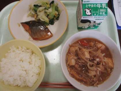 今日の献立は、ごはん、牛乳、鰺のみりん焼き、チンゲンサイソテー、厚揚げの中華煮込みです。