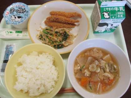 今日の献立は、ごはん、牛乳、きびなごのさくさく揚げ、いり大豆和え、うすくず汁、のり佃煮、ヨーグルトです。