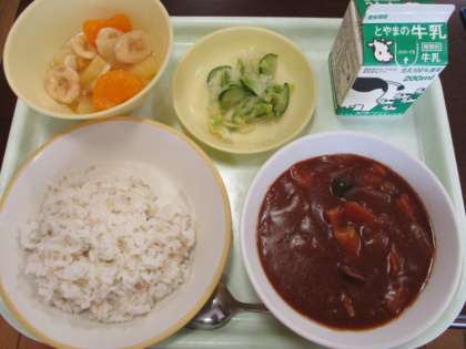 今日の献立は、麦ごはん、牛乳、食べキリンハヤシ、白菜サラダ、フルーツミックスです。ハヤシライスは子供たちの大好きな献立です。