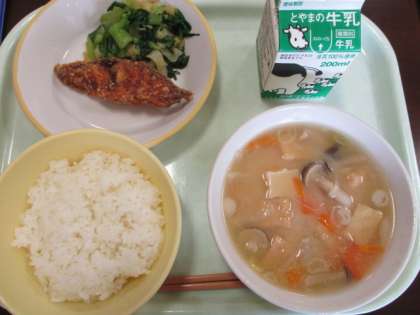 今日の献立は、ごはん、牛乳、魚の竜田揚げ、小松菜のひたし、呉汁です。