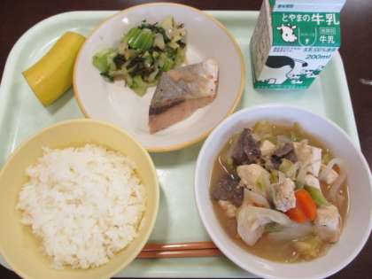 今日の献立は、ごはん、牛乳、ふくらぎの西京焼き、昆布和え、肉豆腐、バナナです。