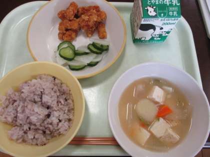 雑穀入りご飯、牛乳、いかのかりん揚げ、2色ピクルス、すいとんです。よくかんで食べましょう。