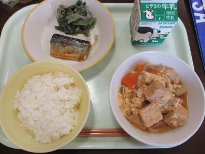 今日の献立は、ごはん、牛乳、さんまのマーマレード煮、よごし、卵とじです。暑い日になりました。おいしい給食を食べて、子供たちは午後からも元気に活動します。