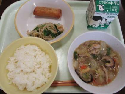 今日の献立は、ごはん、牛乳、春巻き、塩ナムル、八宝菜です。