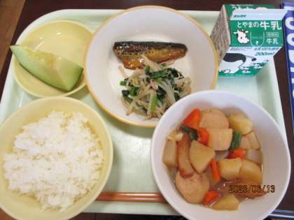 今日の献立は、ごはん、牛乳、いわしの生姜味、ほうれん草のごま和え、関東炊き、メロンです。