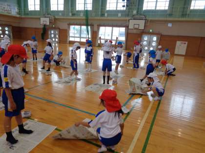 「しまとりじゃんけん」では、新聞紙の島が小さくなってからもバランスをとって島から落ちないように頑張っていました。