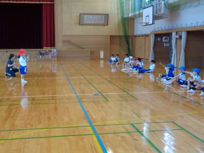 その後、新聞紙を丸めてボール状にし、ボール投げの練習をしました。遠くに投げるために、「上の方に投げるといいね」「ひじをひいてから投げると遠くに飛んだよ」等、投げてみて気付いたことを伝え合いました。
