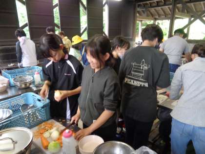 2日目には、野外炊飯でカレーライスをつくりました。主にかまどで火を起こす役割と食材の準備をする役割に分かれ、協力して進めていました。できあがったカレーとご飯は、各班それぞれの個性が出ていました。どれもおいしく仕上がりました。