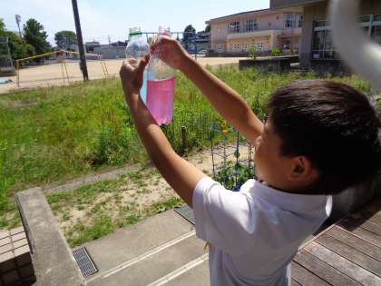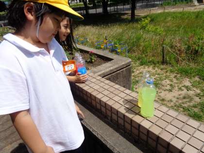 図画工作科では、ペットボトルに色水を入れました。光にかざしながらペットボトルを重ねると色が変わって見えることや、反射するときらきらと輝いて見えることに気がつきました。