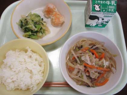 今日は子供たちが大好きなラーメンです。今日の献立は、ごはん、牛乳、にんじんシューマイ、しょうがひたし、とんこつラーメンです。野菜がたっぷり入ったラーメンでおいしいです。