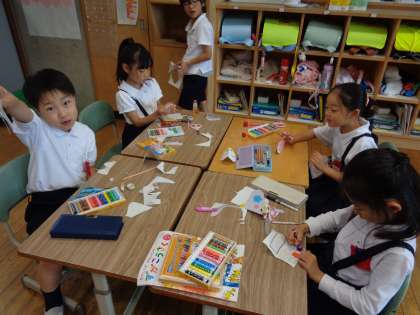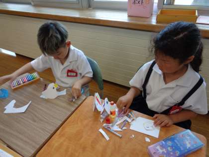 図画工作「おって たてたら」の学習をしました、紙を立てるためにはどのようにおると良いか色々試し、鳥や山などを作ってみました。「次はみんなで町を作ろう」と伝えると、何を作りたいか口々につぶやいており、楽しみにしている様子でした。