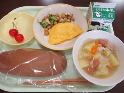 今日の献立は、ココアコッペパン、牛乳、チーズオムレツ、きのこと豆のアヒージョ、ポトフ、さくらんぼです。さくらんぼがおいしい季節です。やわらかくて甘いさくらんぼでした。
