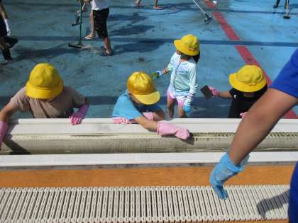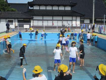 今日は上学年でプール清掃をしました。上学年の頑張りでみんなで使うプールが綺麗になりました。プール開きが楽しみです。