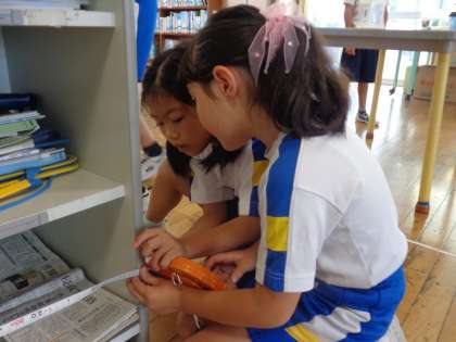 巻き尺を使い長さを測っています。今回で2回目。巻き尺のはかり方にも慣れ、上手に測ったり長さを読んだりしていました。