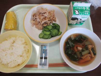 今日の献立は、ごはん、牛乳、豚肉のジャンロー、きゅうりもみ、沢煮椀、のり佃煮、バナナです。