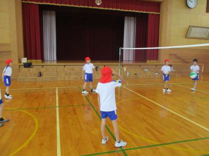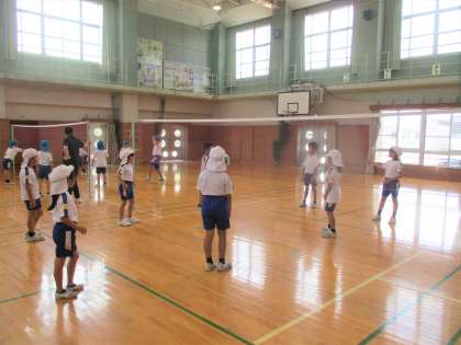 3,4年生でチームをつくり、ビーチボールをキャッチしたり相手コートに投げ入れたりして、ネットをはさんでのラリーを楽しみました。