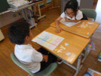 算数科では、100より大きな数の学習をしています。ペアで数カードを使いながら数の数え方を確認したり、問題を出し合ったりし、楽しみながら活動しています。