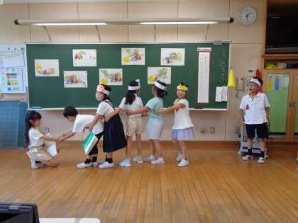 大きな声で堂々と発表する子供や、お面をつけて役になりきる子供等、思い思いに発表を楽しんでいました。