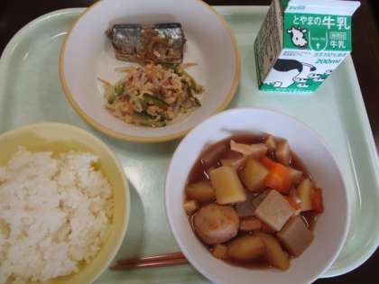 今日の献立は、ご飯、牛乳、さんまの生姜焼き、ベーコンとゴーヤの卵炒め、炊き合わせです。ゴーヤのおいしい季節ですが、子供たちにとっては苦手な野菜のようです。給食のゴーヤは苦みがほとんどなく、おいしく食べることができました。
