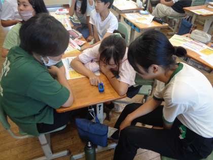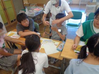 今日は2名の看護師さんを講師に迎え、仕事のやりがいについて話をしていただきました。また、聴診器で自分の心音を聞いたり、アルコール消毒によってどれだけ手がきれいになっているかを確かめたりしました。看護師という仕事への関心が高まった様子の子供たちでした。