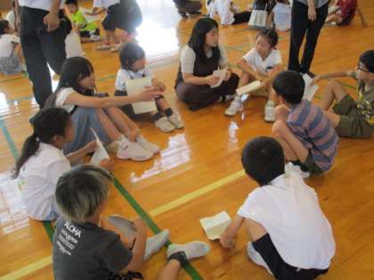 次にファミリー班の発表を基に考えたことを全体で聴き合いました。さすがに全校の前で発言するのは勇気が要り、時間の制限もあって数名の発言でしたが、「友達と仲よくできた」「1年生も学校のために考えてくれていてうれしかった」「傷つく言葉を言うと笑顔が減るので、そういう言葉を減らしたい」等の意見がありました。