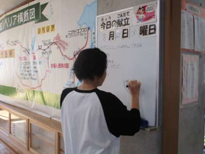 今日から給食が始まります。職員室前のホワイトボードに、6年生が献立とイラストを描いてくれていました。全校のために自分で考えて活動できる姿がすばらしいです。