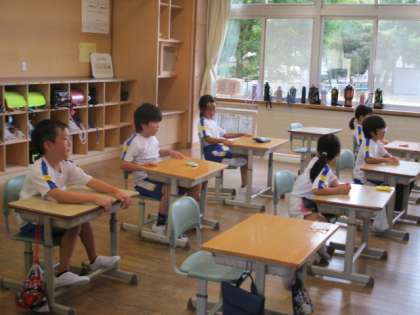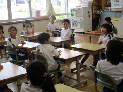 1年生は夏のしりとりをしていました。2年生は、先生の話をしっかりと聞いていました。4年生は、夏休みの作品の紹介をしていました。