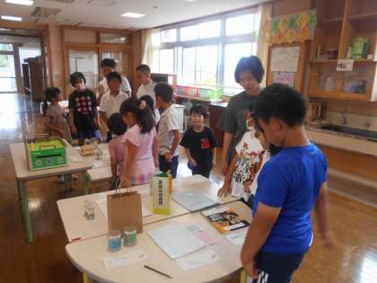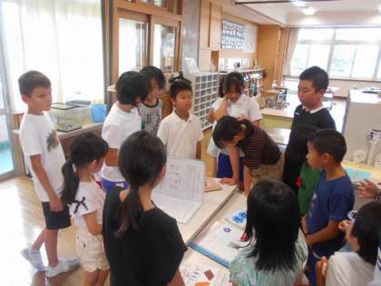 昼休みの「のびのびタイム」に、縦割りファミリーで、互いの夏休みの作品を紹介し合いました。それぞれの作品に、みんな興味津々でした。