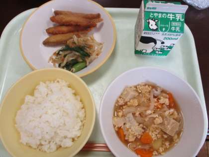 今日の献立は、ご飯、牛乳、わかさぎのフリッター、香味和え、高野豆腐の卵とじです。