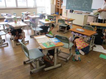 9月1日は防災の日です。学校では、震度6の地震を想定した避難訓練を実施しました。「まず低く」「頭を守り」「動かない」の3つの約束を守り、机の下に身をかがめて訓練しました。