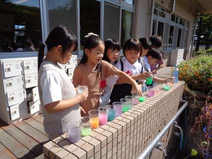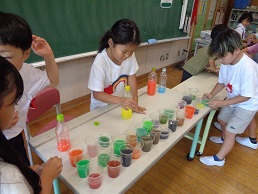 ペットボトルに色水をつくり、色水を混ぜたり並べたりして楽しみました。