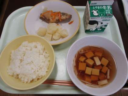 今日の献立は、ごはん、牛乳、ふくらぎのマリネ、こふきいも、すまし汁です。
