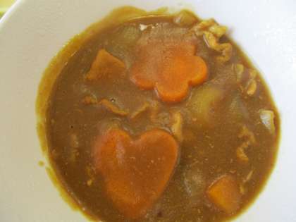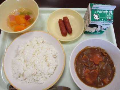 今日の献立は、子供たちが大好きなカレーライスです。カレーには可愛い形のにんじんが入っていて、うれしい気持ちになりました。ウインナー、フルーツカクテルもおいしかったです。