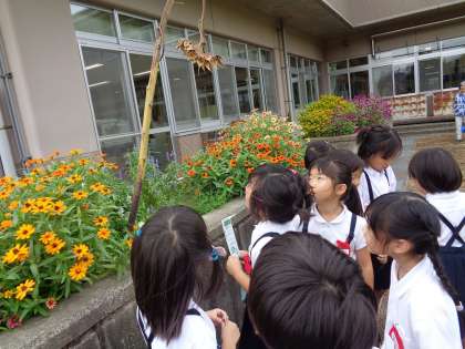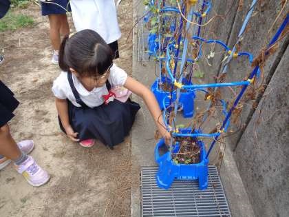 植木鉢の土に、こぼれた種から芽が出ていることに気が付いた子が、みんなに伝えてくれました。周りを見てみると、地面のあちこちからも芽が出ていて、「こっちにも芽が出ているよ!」「こっちにもあるよ!」と伝え合っていました。