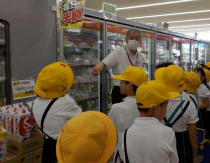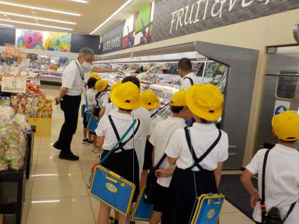 スーパーマーケットの見学に行きました。店内を見てまわったり質問をしたりしてお店の工夫を見つけていました。