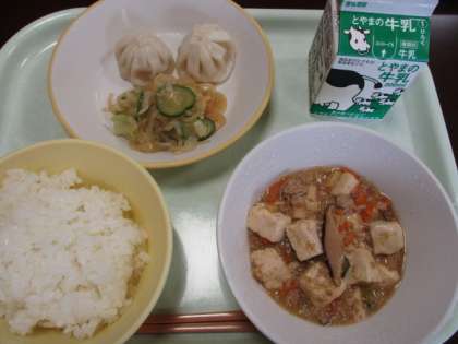 今日の献立は、ご飯、牛乳、えび包子、バンサンスー、マーボー豆腐です。子供たちは、朝から給食を楽しみにしています。
