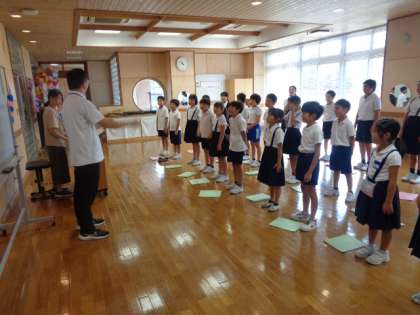 3、4年生合同で練習をしました。自分の場所を確認した後、歌や手拍子のタイミングを確認しながら歌いました。