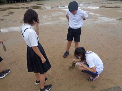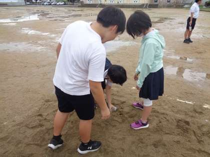 運良く晴れ間がのぞいたため、地層をつくる実験で使用する砂や泥をペットボトルに集めに行きました。いろいろな場所から集める子供たちでした。