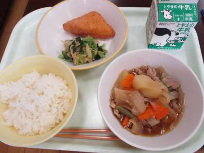 今日の献立は、ご飯、牛乳、はんぺんフライ、はりはり和え、肉じゃがです。
