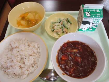 今日の献立は、麦ご飯、牛乳、食べキリンハヤシ、大豆サラダ、フルーツゼリーミックスです。