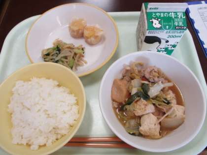 今日の献立は、ごはん、牛乳、にんじんシューマイ、もやしのおひたし、すきやきです。すきやきはお肉がたくさん入っていて、おいしいです。
