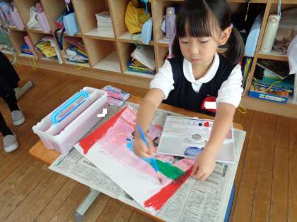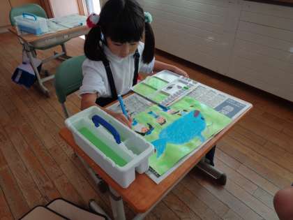 先日の学習成果発表会で演じた「くじらぐも」の絵に絵の具で色を塗りました。