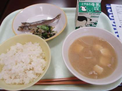 今日の献立は、ごはん、牛乳、ししゃもの米粉揚げ、磯和え、さつま汁です。