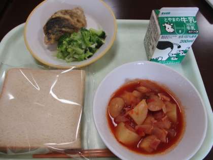 今日の献立は、食パン、牛乳、魚のえごま揚げ、添え野菜、豆とベーコンのトマト煮です。魚は大きな鯵で、とても美味しかったです。
