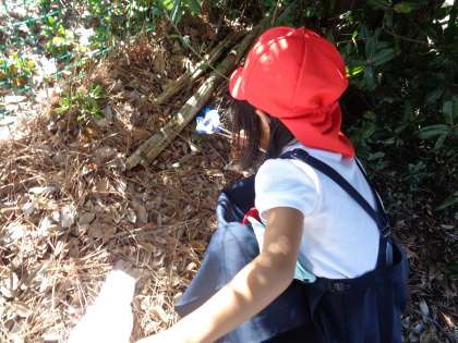 先日、生活科「あきをたのしもう」の学習で、校庭のドングリやきれいな色の落ち葉を探していたときに、いくつかゴミが落ちていることに気付いた子供たち。「学校の中だけきれいにしても意味がないと思う」「学校全部をきれいにしたい」と話し合い、今日は、校庭に落ちているゴミを進んで拾いに行きました。