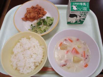 今日の献立は、ごはん、牛乳、ポークチャップ、アスパラサラダ、秋の香りシチューです。シチューにはじゃがいもやさつまいも、しめじなど、秋の野菜が入っていました。