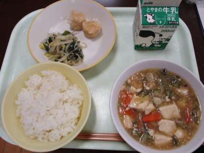 今日の献立は、ごはん、牛乳、にんじんシューマイ、酢の物、えびと豆腐のうま煮です。