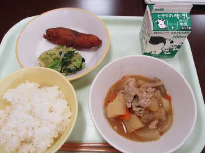 今日の献立は、ごはん、牛乳、魚の竜田揚げ、おひたし、豚肉の南蛮煮です。豚肉の南蛮煮はぴりっと辛くて、ご飯が進みます。