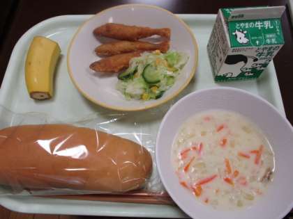 今日の献立は、米粉コッペパン、牛乳、わかさぎのフリッター、コールスローサラダ、クラムチャウダー、バナナです。温かいクラムチャウダーにはホタテが入っていて、美味しかったです。