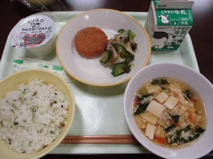 菜めし、牛乳、とやまミートコロッケ、とろろ昆布和え、かき玉汁、リンゴヨーグルトです。富山の献立ということで、野菜の和え物にとろろ昆布が使われていました。また、昼の放送で「富山のコロッケ消費量は全国トップ3に入ります」と紹介がありました。初めて知って驚きました。